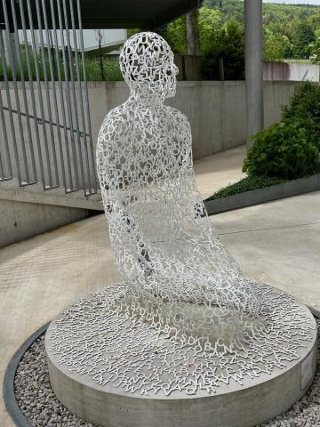 Sous la canopée de la Fondation Michalski pour l’écriture et la littérature, le « voleur de mots » de Jaume Pensa accueille quelques 25 membres de l’Union Belge de Neuchâtel et de la SRUBL qui se retrouvent pour découvrir leur compatriote Georges Simenon. Photos, films et textes révèlent le parcours mouvementé de cet écrivain très prolifique (103 Maigret, 117 romans durs et 25 textes autobiographiques). Après une carrière internationale, il choisit Lausanne comme destination finale. Puis ils suivent la jeune guide et historienne de l’art pour découvrir l’histoire et l’architecte originale de cette Fondation qui en plus d’organiser des conférences et des expositions en lien avec la littérature, dispose d’une magnifique bibliothèque ouverte à tous contenant des ouvrages en un multitude de langues. Dans la canopée se cachent des cabines où des écrivains en résidence suivent l’inspiration de leur muse dans un cadre idyllique et inspirant. Tous nous aimerions renouveler une telle rencontre entre unions belges et ainsi avoir l’opportunité de créer de liens en partageant notre belgitude.