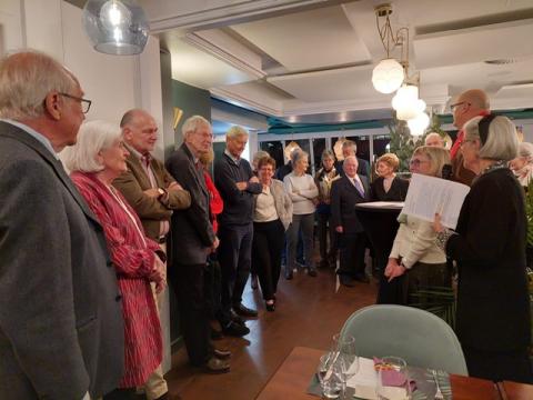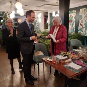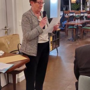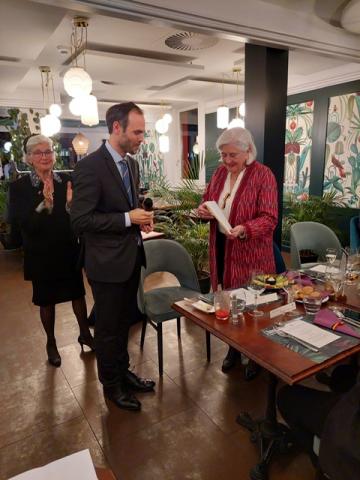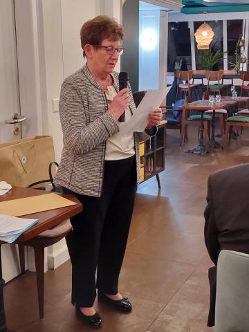 Le 14 novembre 2024 à l’hôtel de L’Union à Epalinges, la soirée pour honorer Anne Rosat fut charmante et se déroula dans une ambiance chaleureuse. La présentation par Anne de son parcours de vie nous a tous beaucoup touchés par sa sincérité, son enthousiasme et son engagement de toute une vie tant dans le domaine humanitaire qu’artistique. Michel Berode a rappelé l’historique du Prix Olga Tobler Kocken et expliqué pourquoi le Jury a porté son choix sur cette « Grande Dame ». Le consul de Belgique, Mattias Van Hecke, a analysé avec brio et en détails la maîtrise du travail de notre lauréate dans un discours éloquent. Nous avons été honorés par sa présence. Ce soir, nous avons aussi célébré la Fête du Roi en nous rappelant les mots du Roi Baudouin disant cette fête honore toute la famille royale mais aussi tous les volontaires qui se dévouent pour la Belgique. La Brabançonne a résonné dans la salle en l'honneur de notre patrie.