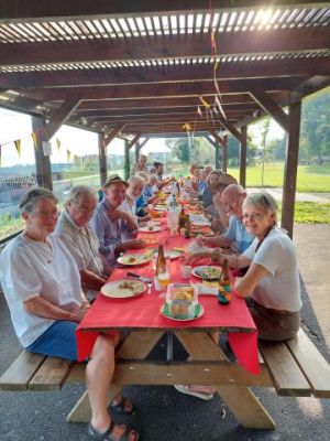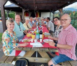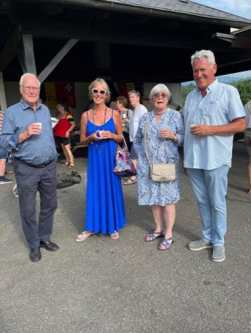 Le 19 juillet 2024, une belle quarantaine de membres de l’Union belge du Valais et de la SRUBL se retrouve à Corsier-sur-Vevey pour fêter notre pays dans la bonne humeur avec une météo fantastique. Pas de drache nationale… Drapeaux des deux Unions, fanions, portrait royal, décoration noir, jaune, rouge jusqu’aux toilettes des dames et la brabançonne trilingue ont créé une ambiance festive autour d’un barbecue arrosé de champagne, bières belges et vins. Tous ont mis la « main à la pâte » en apportant des plats originaux et exquis allant de l’apéro, aux salades et pour finir des desserts gourmands. Une soirée mémorable dont témoigne la galerie de photos.