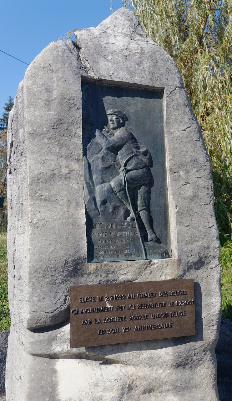 Après la mort du roi lors d’une escalade à Marche-les-Dames le 17 février 1934, ces anciens combattants ont pris l’initiative de faire ériger dans le jardin du chalet une stèle rendant hommage au Roi qui fut leur chef au bord de l’Yser. Le Roi Albert 1er était un passionné d'alpinisme, auteur de courses restées célèbres (Aiguille du Tour, traversée des Drus, ...) et il a laissé son nom à la Torre Re Alberto dans les Alpes Centrales, escaladée en 1933. La stèle commémorative réalisée par Mr. Schmidt-Hény représente le Roi Albert en escalade et fut inaugurée en 1939. Deux textes de l'époque relatent cet épisode "Le Confédéré du 19 juin 1939" et un autre article paru un peu plus tard