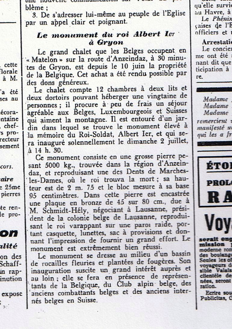 Véritable pendant à la statue « La Belgique reconnaissante » du quai de Belgique à Ouchy, le monument « Albert 1er » à Gryon représente un autre pan des relations privilégiées établies entre la Belgique et la Suisse dans le décours de la 1ère Guerre Mondiale.